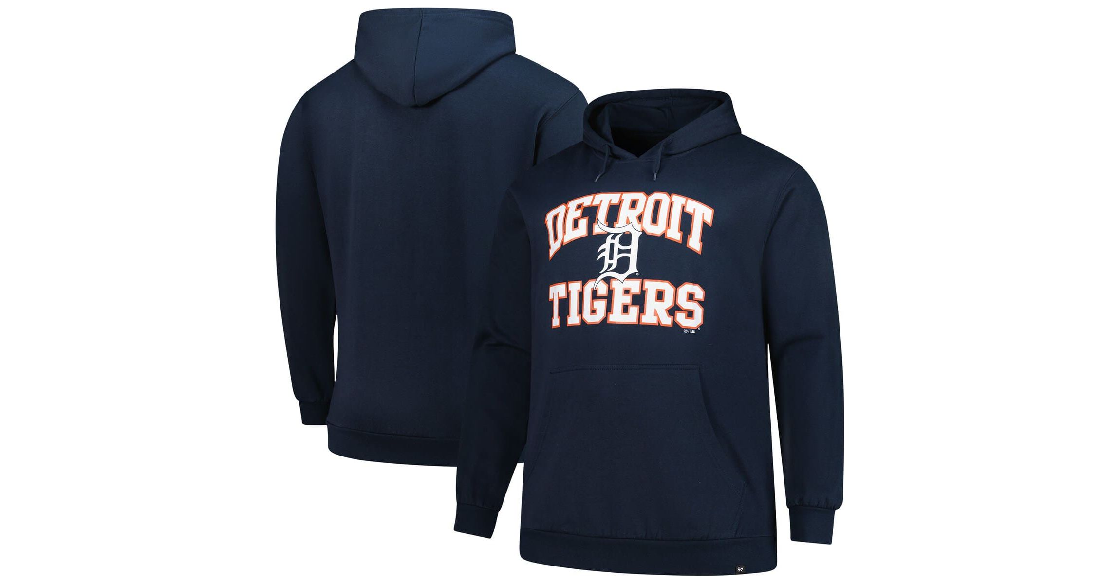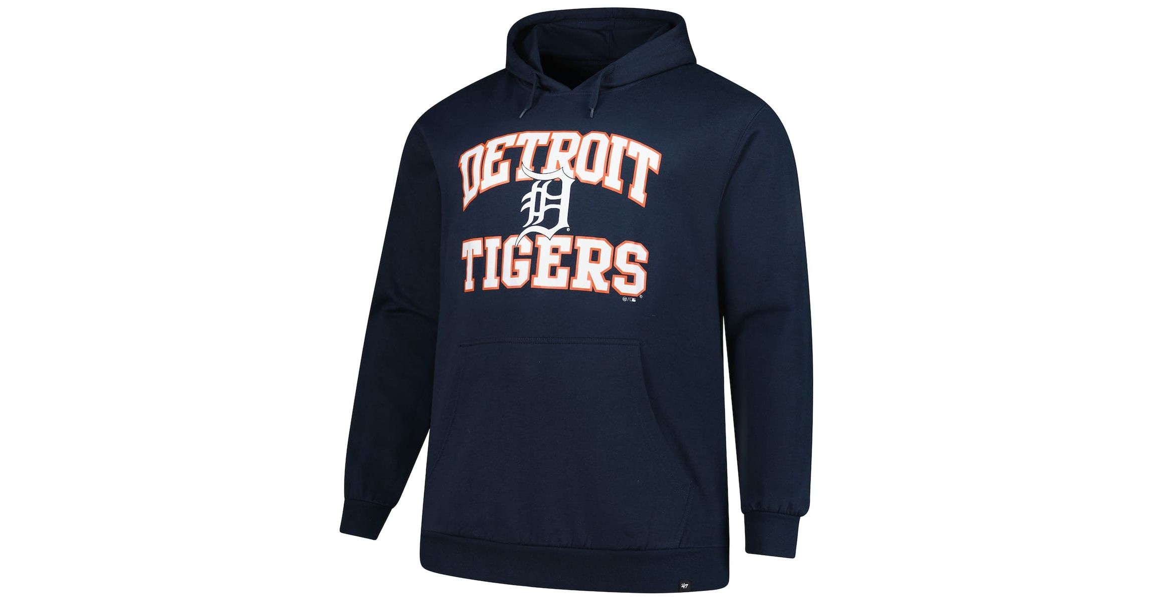 Stay warm and show your Detroit Tigers pride with this '47 Big & Tall Velocity Fleece Pullover Hoodie. This midweight hoodie features a soft fleece lining for an extra layer of warmth and comfort, making it perfect for moderate temperatures. The stacked screen print team graphics on the front let you show off your Detroit Tigers pride in style. Adjustable drawstring hood; Brand: '47; Front pouch pocket provides warmth for your hand; Hooded; Imported; Long sleeve; Machine wash, tumble dry low; Material: 60% Cotton/40% Polyester; Midweight hoodie suitable for moderate temperatures; Officially licensed; Pullover; Soft fleece lining for an extra layer of warmth and comfort; Stacked screen print team graphics on front.