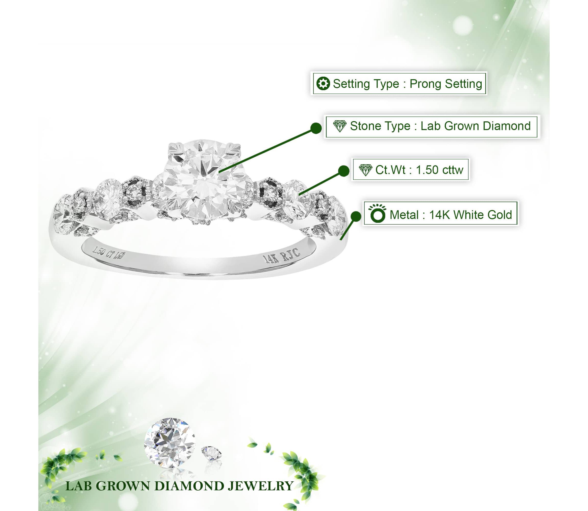 Lovely, uniquely designed, 1.50 cttw lab grown diamond engagement ring in 14k white gold with rhodium plating. The 25 dazzling round shaped lab created diamonds are VS1-VS2 clarity, E-F color and set in prong setting. The center diamond weighs 1 cttw while the side diamonds weigh 0.50 cttw. Gift box is included with purchase of this diamond bridal ring.
