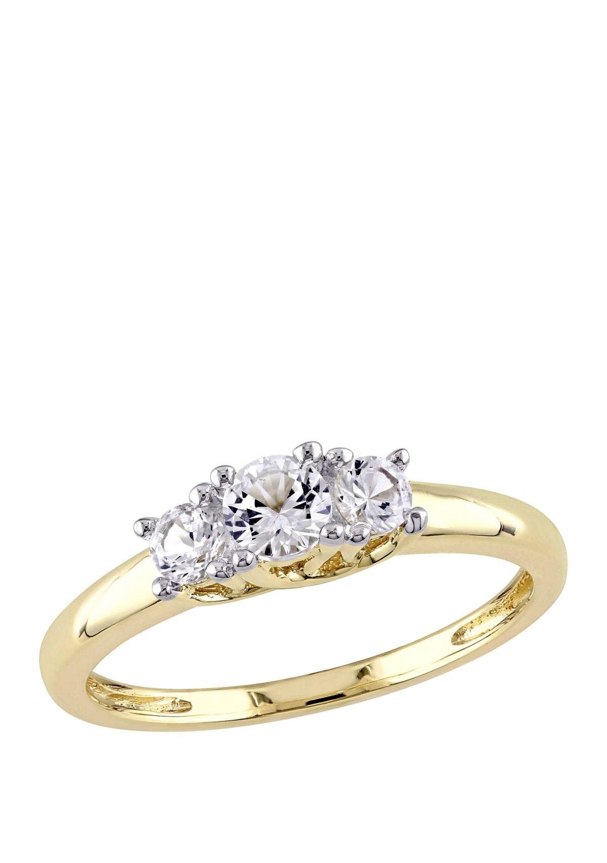 This classic three-stone ring from Belk & Co. is crafted in lustrous Yellow Gold and shimmers with round-cut (4-millimeter and 3-millimeter) 5/8 ct. t.w. Lab-Created White Sapphires. This ring is enhanced with a high polish finish.