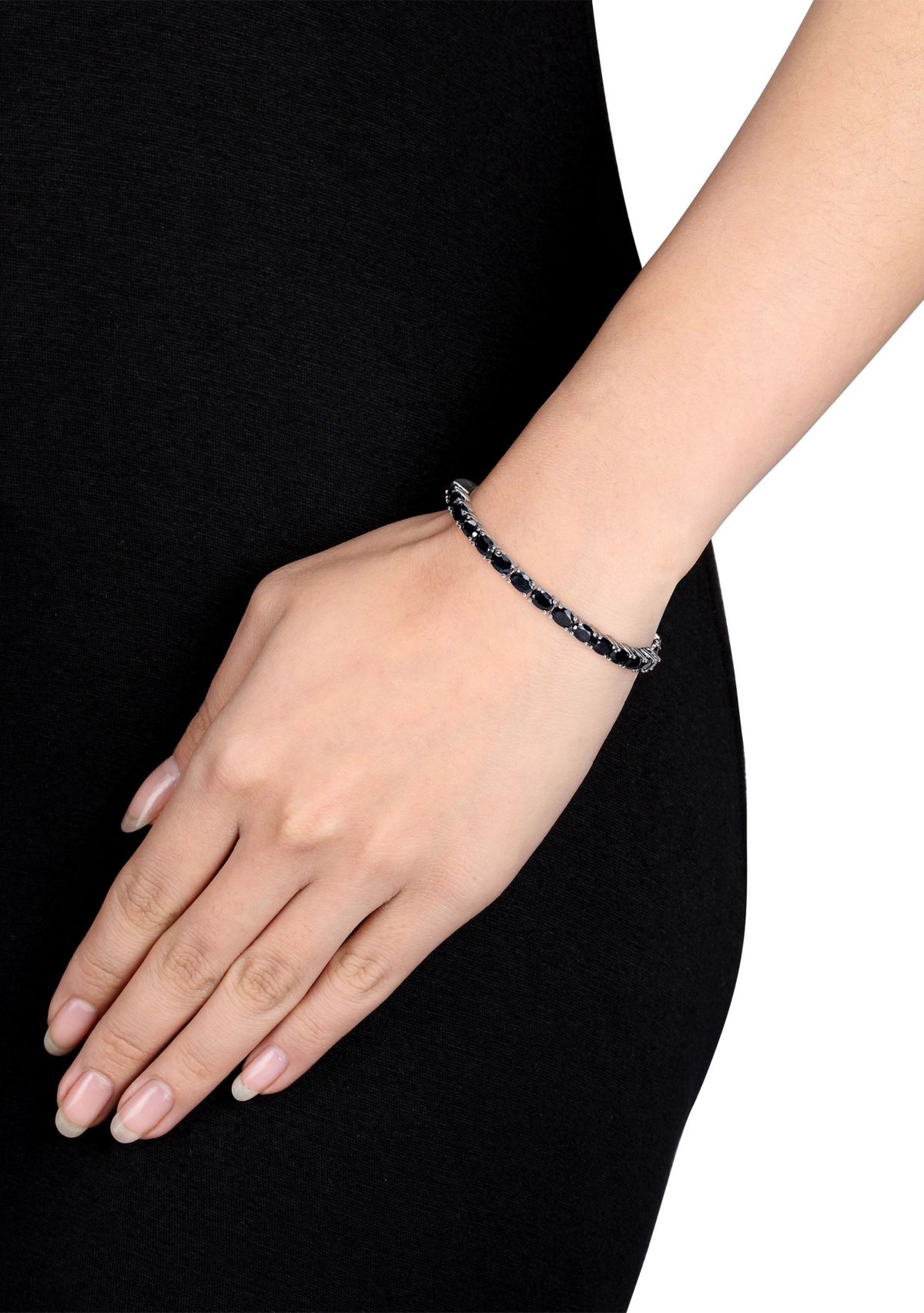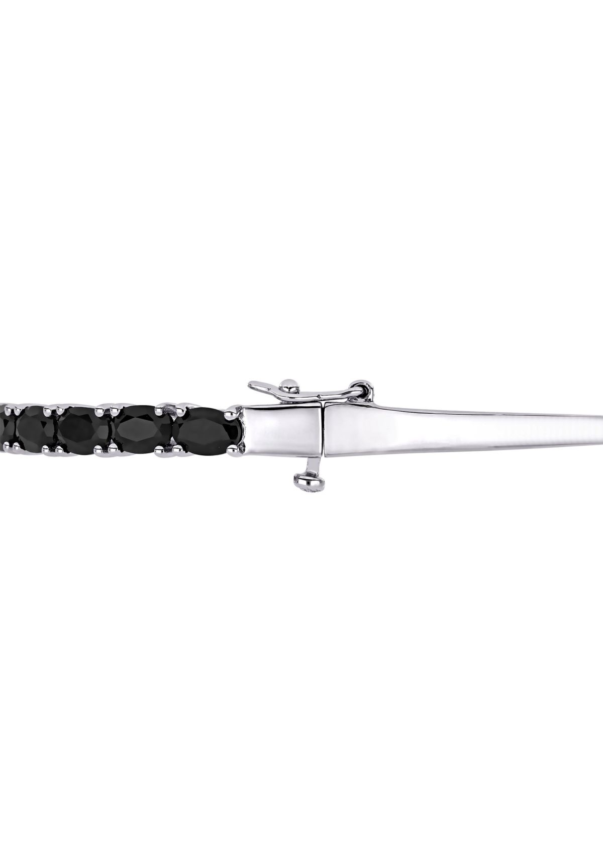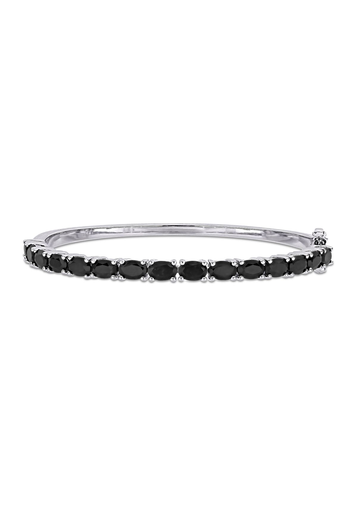 Elegance never goes out of style, and neither will this Asteria Black Sapphire Bangle. Crafted in gleaming sterling silver, it features 15 oval-cut, prong-set black sapphire gemstones (6 x 4mm) studded along the top of the bangle. Enhanced with a high-polish finish, this attractive gemstone bangle coordinates easily with other jewelry and accessories. This marvelous black sapphire bangle secures with pressure tongue clasp for longer strength and durability and stacks well with other bracelets.