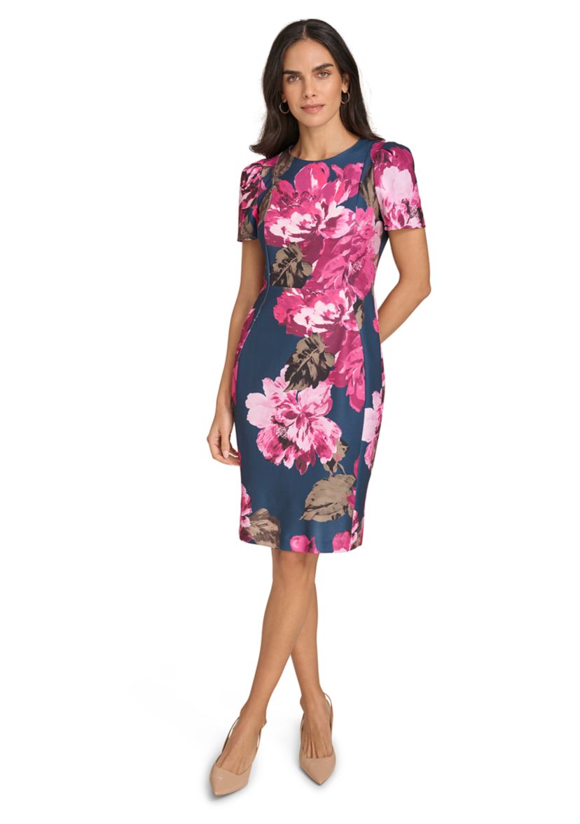 Brilliant florals add gorgeous sophistication to this sheath dress from Calvin Klein.