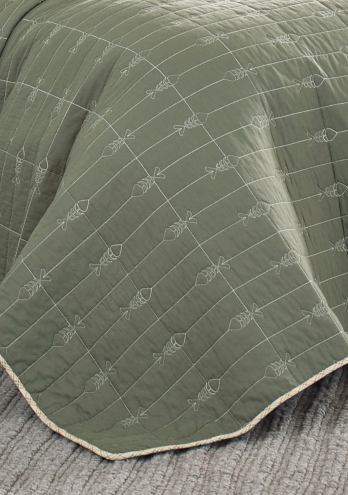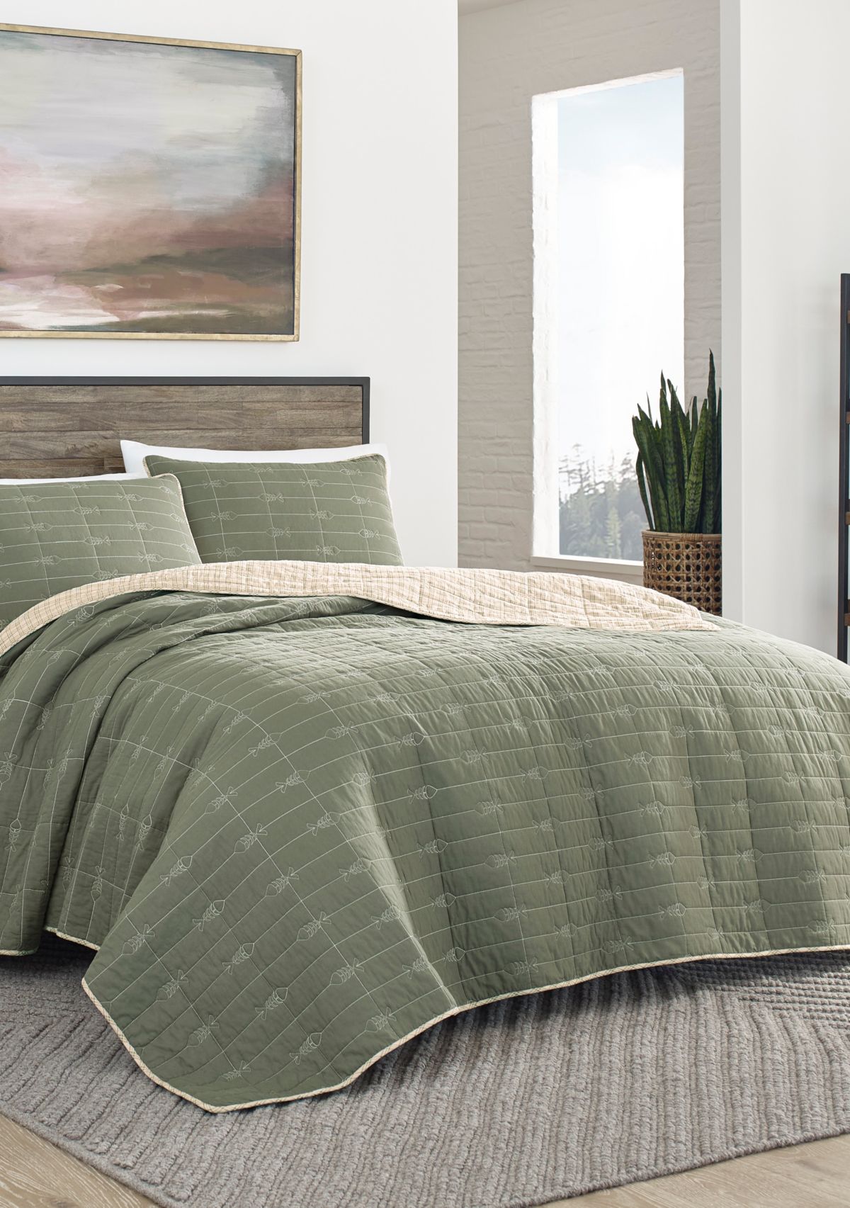 Transform your bedroom into a cabin retreat with the Eddie Bauer Troutdale Cotton Quilt Set. The stylish green quilt and coordinating shams feature a trout stitch design with a versatile khaki plaid reverse. The all-cotton set is pre-washed for added softness and its lightweight comfort offers year-round versatility. Perfect alone or as a layering accent, this rustic quilt set is an essential update to any bedding ensemble. The quilt is polyester filled and machine washable for easy care.