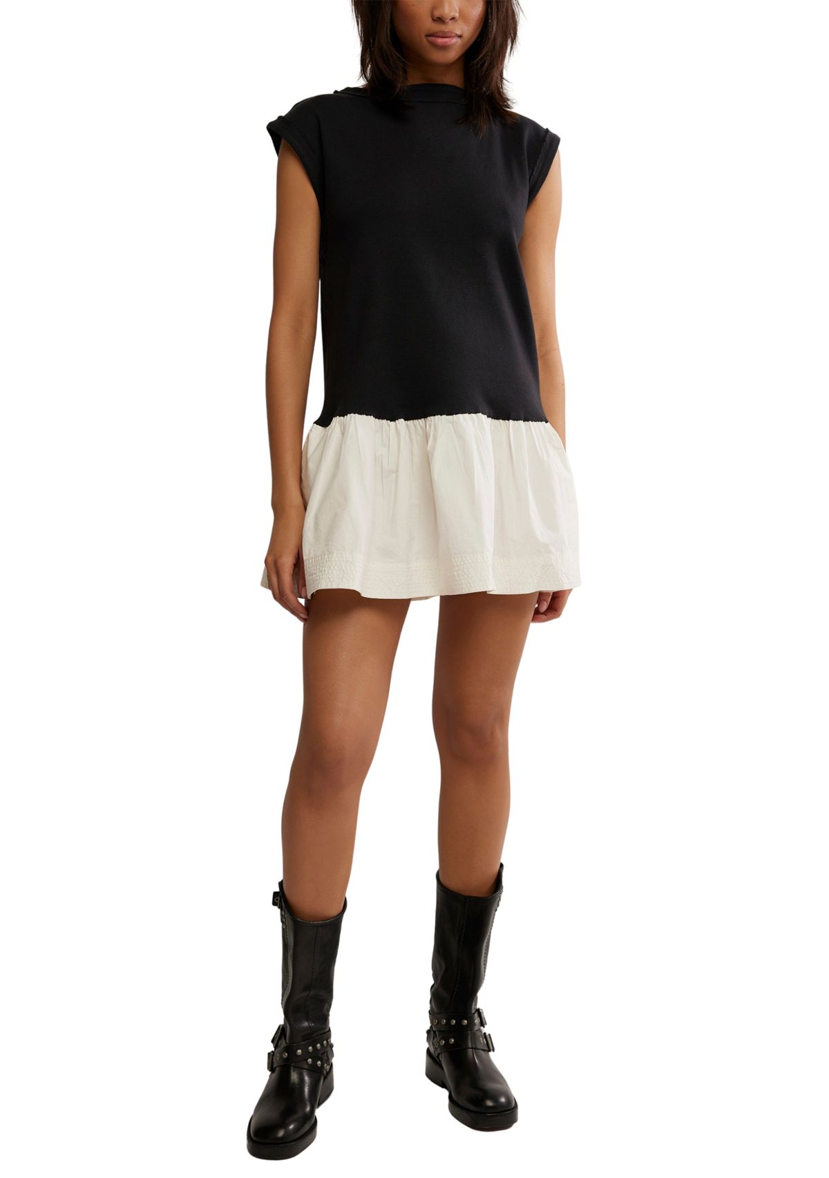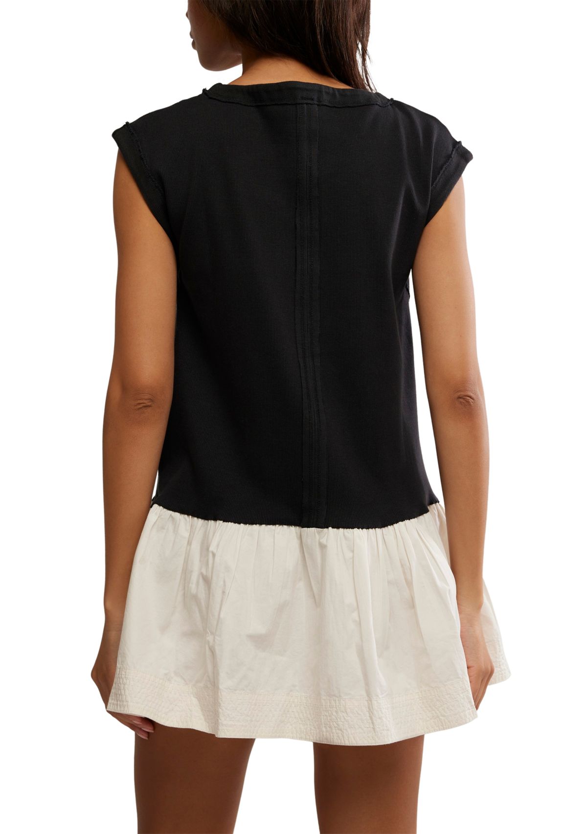 The Free People Enya Mini Dress boasts a black ribbed body with ruffle skirt and pockets.