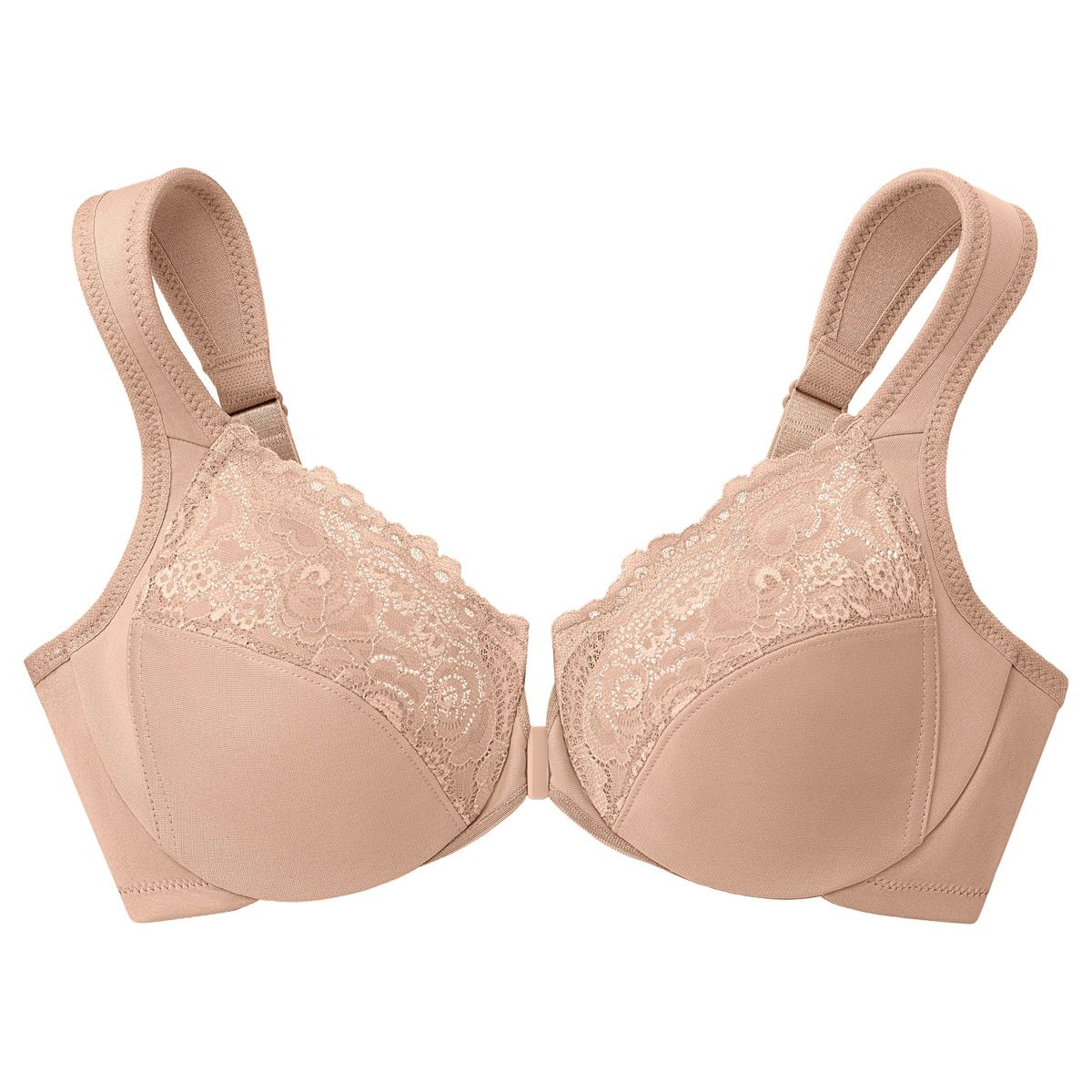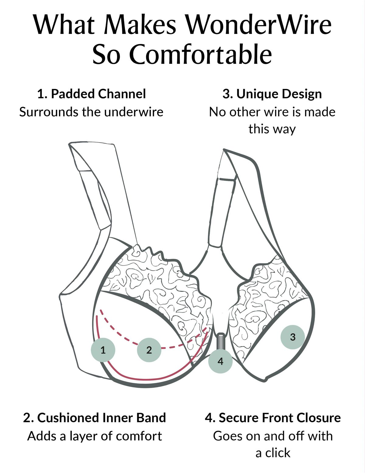 At the intersection of convenience and comfort is this plus-size bra. The secure front clasp goes on and off in a pinch while the cushioned wire never gets close enough to pinch back. WONDERWIRE TECHNOLOGY: A padded underwire adds an extra layer of cushion to prevent wire poke. SUPPORT: Lace-topped cups feature side-bust control to shape and support. FRONT CLOSURE: Easy on and off secure front closure. CUSTOM FIT: Wide, cushioned straps adjust to your fit. DESIGNED IN NEW YORK SINCE 1921: We have over 100 years experience crafting bras for curvy women.