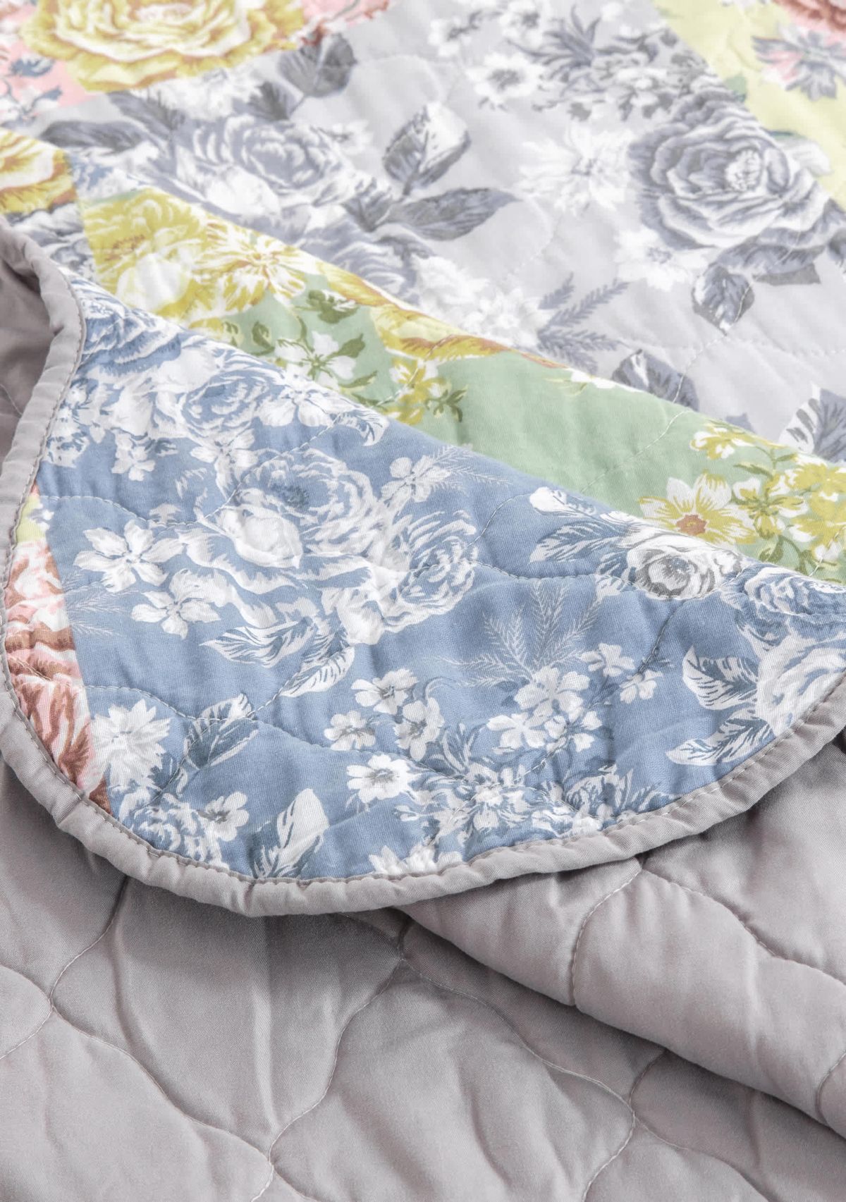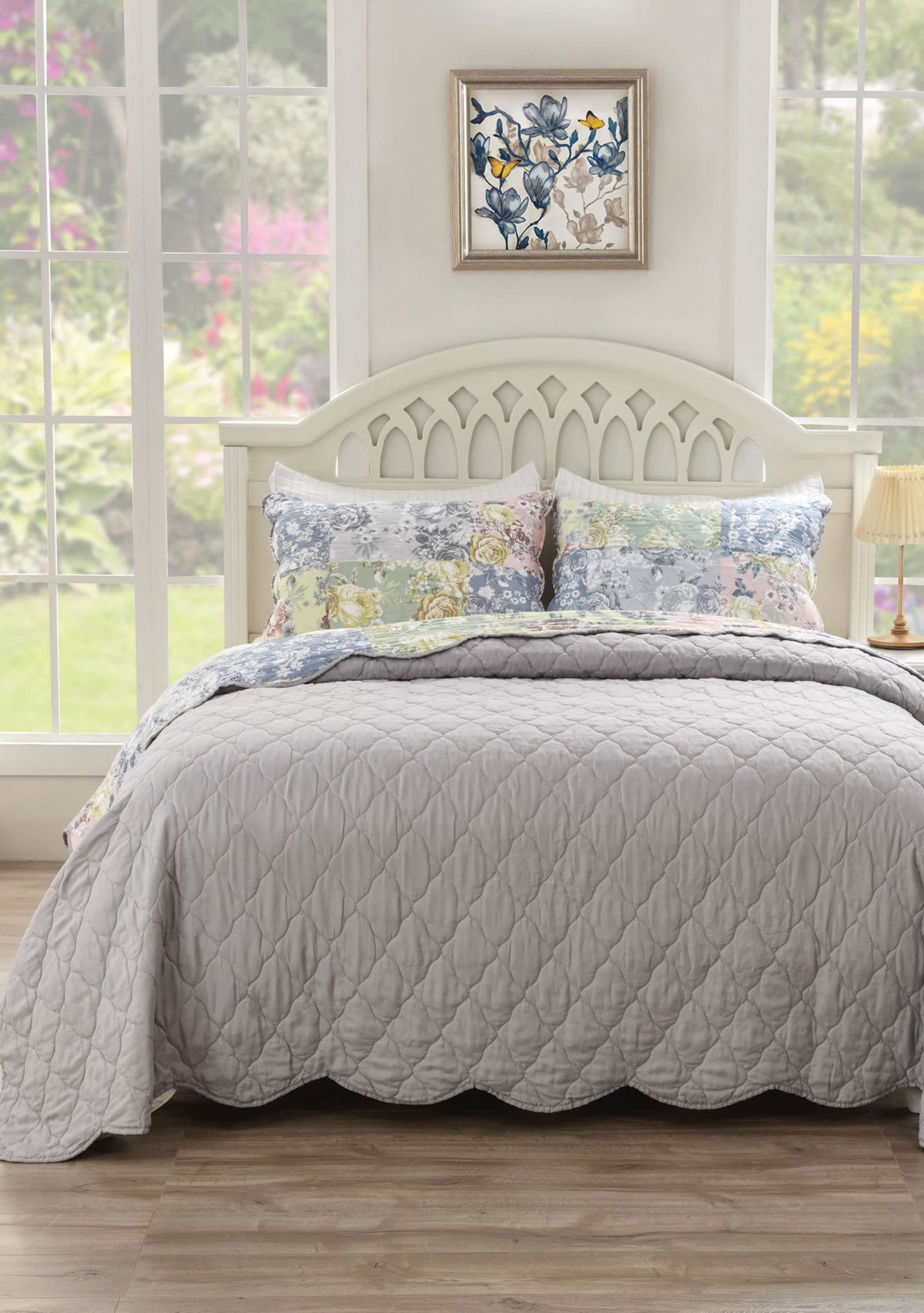 Constructed from cotton fabric with scalloped borders and a cotton-rich fill, Emma features florals in a patchwork of alluring hues. Lightweight for year-round layering and comfort, this new classic from Greenland Home Fashions will feel right at home with a variety of interior decor themes. The patchwork print is overstitched in a vermicelli pattern that offers durability with surface interest. Reverses to an all-over neutral gray for easy pairing with any sheet set in your linen closet. Oversized for better coverage on today’s deeper mattresses. Quilt set comes with quilt and two pillow shams (one sham per Twin set). Dimensions: Twin set includes one 68x88-inch quilt plus one 20x26-inch pillow sham, Full/Queen set includes one 90x90-inch quilt plus two 20x26-inch pillow shams, King set includes one 105x95-inch quilt plus two 20x36-inch pillow shams. All dimensions +/- 2 inches. Machine quilted with fabric bound edges for durability. Machine washable. 100% Cotton face; brushed microfiber back; cotton rich 60% cotton, 40% polyester fill. Imported