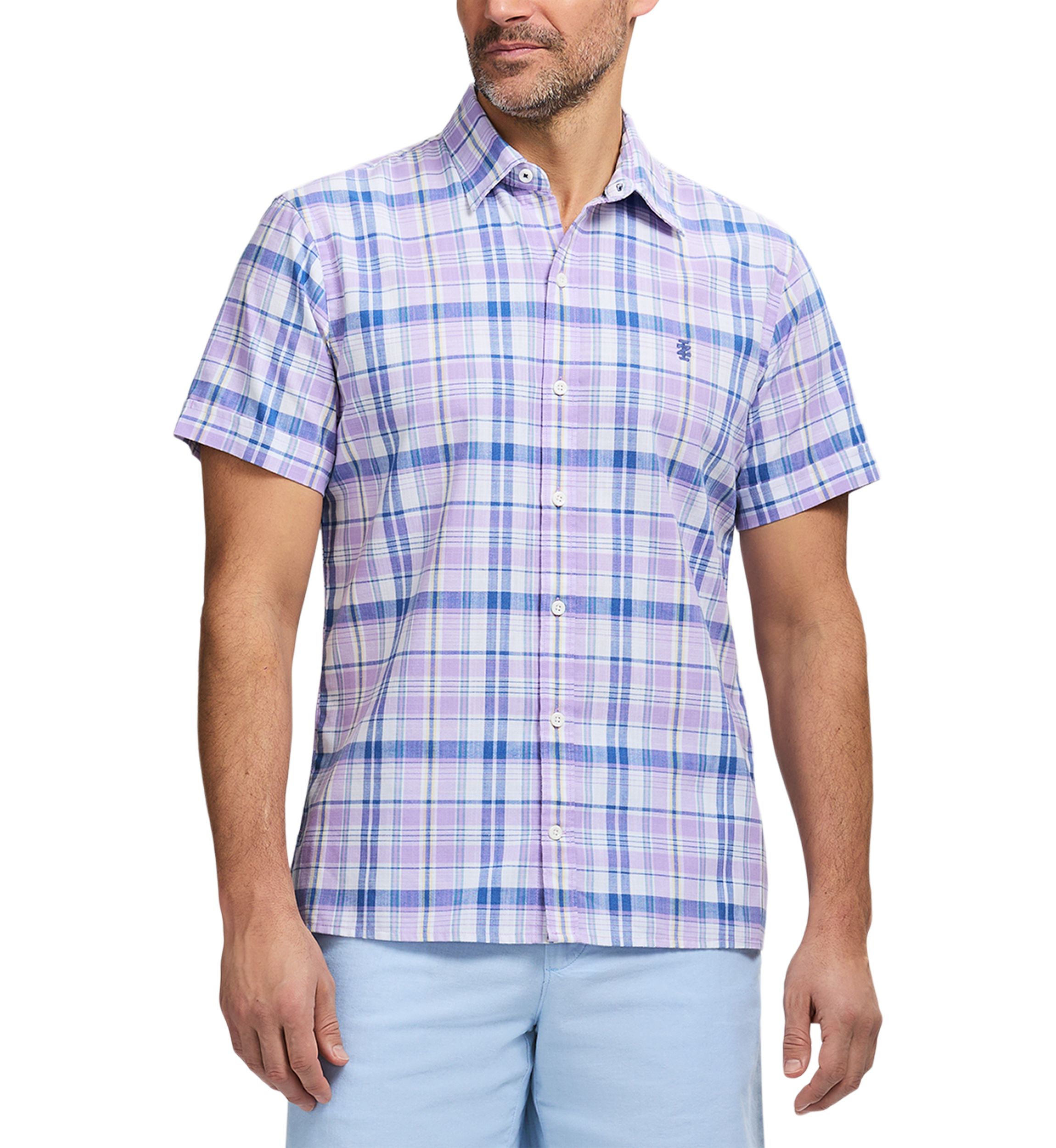 Madras plaid lends classic everyday style to this short-sleeved shirt from IZOD.