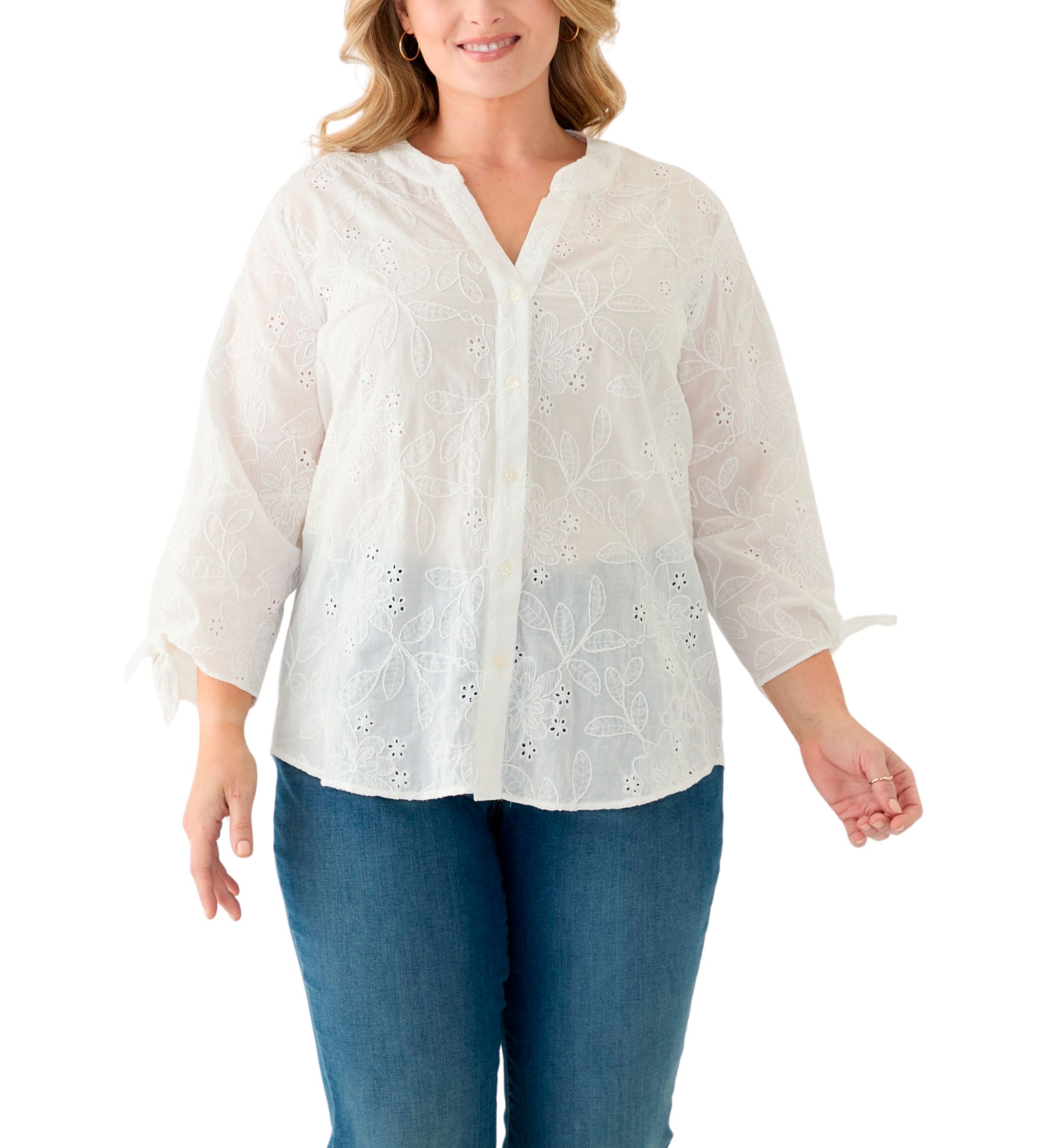 JONES NEW YORK Plus Size Y-Neck Button Front Roll Sleeve Blouse