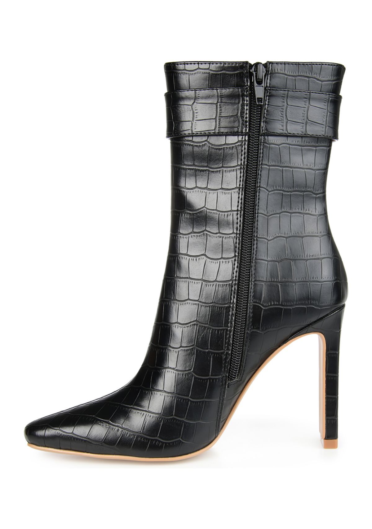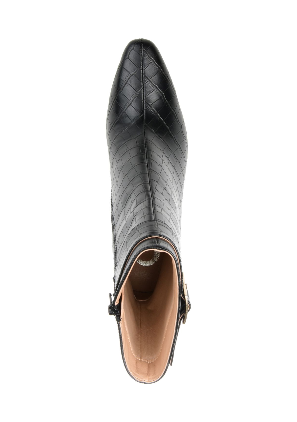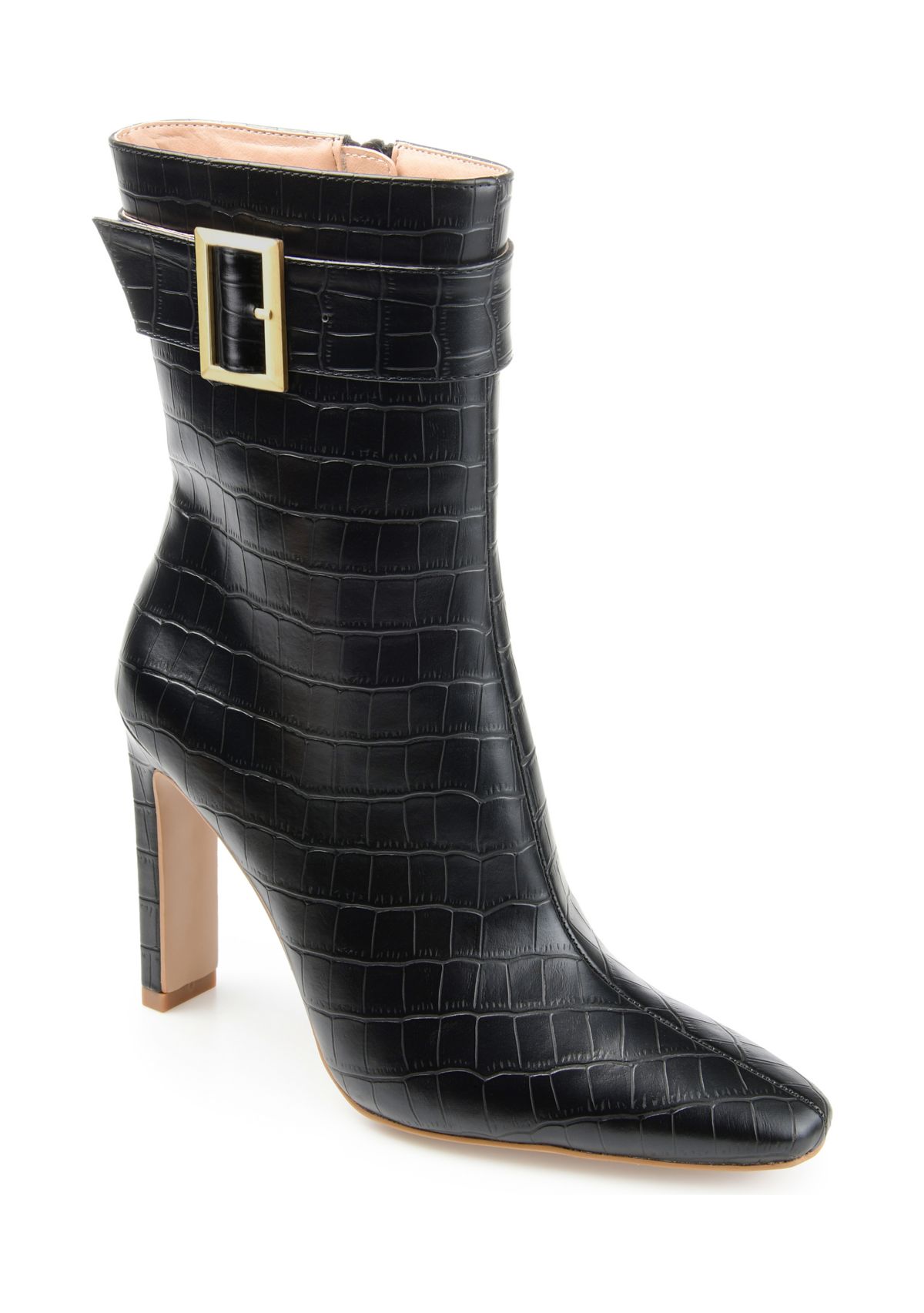 A shapely ankle bootie that is sure to turn heads, the Elanie by Journee Collection. This croc textured vegan leather silhouette is styled with square-toe and a buckled ankle strap for an upscale look. A block heel and a 4 mm Tru Comfort Foam™ footbed perfect the design for a walkable lift.