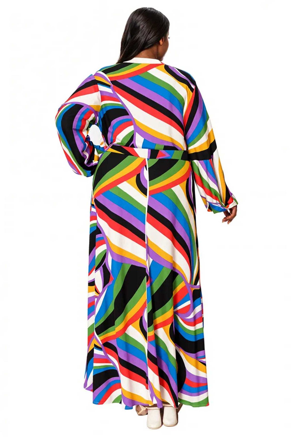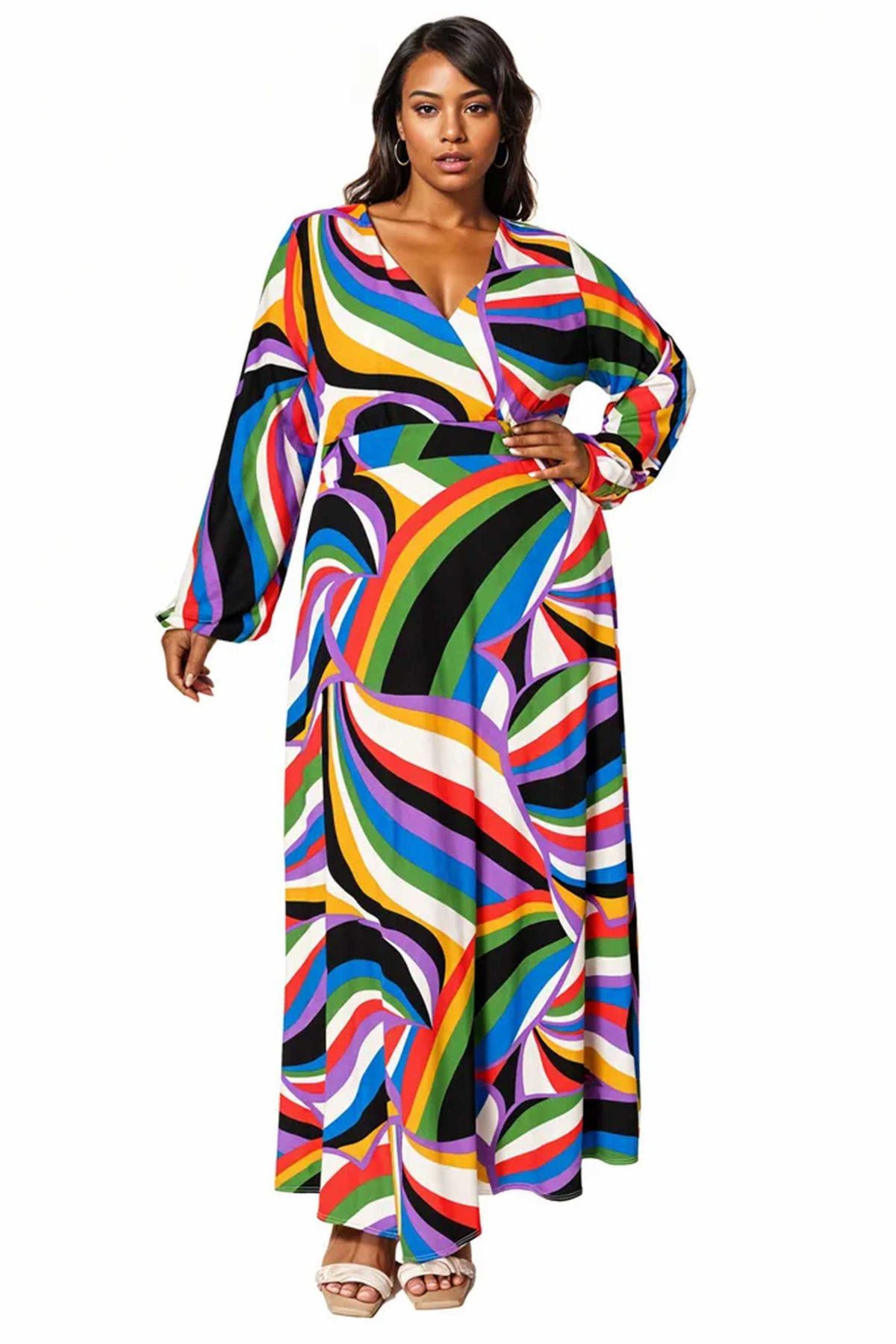 Step into the spotlight with this stunning maxi dress that combines bold color with effortless elegance. Featuring a vibrant rainbow print, this dress will instantly brighten your wardrobe while keeping you chic and comfortable for any occasion.