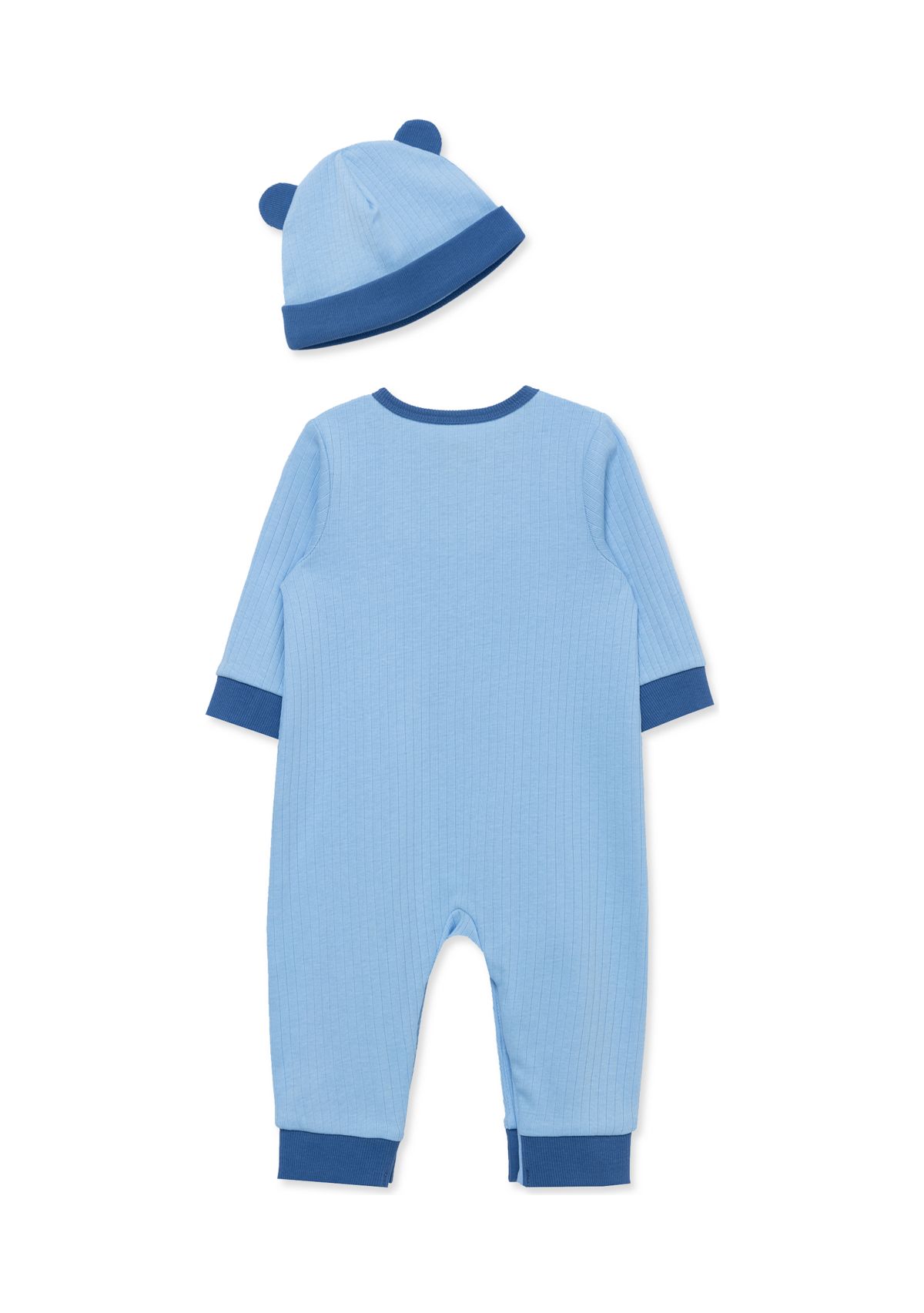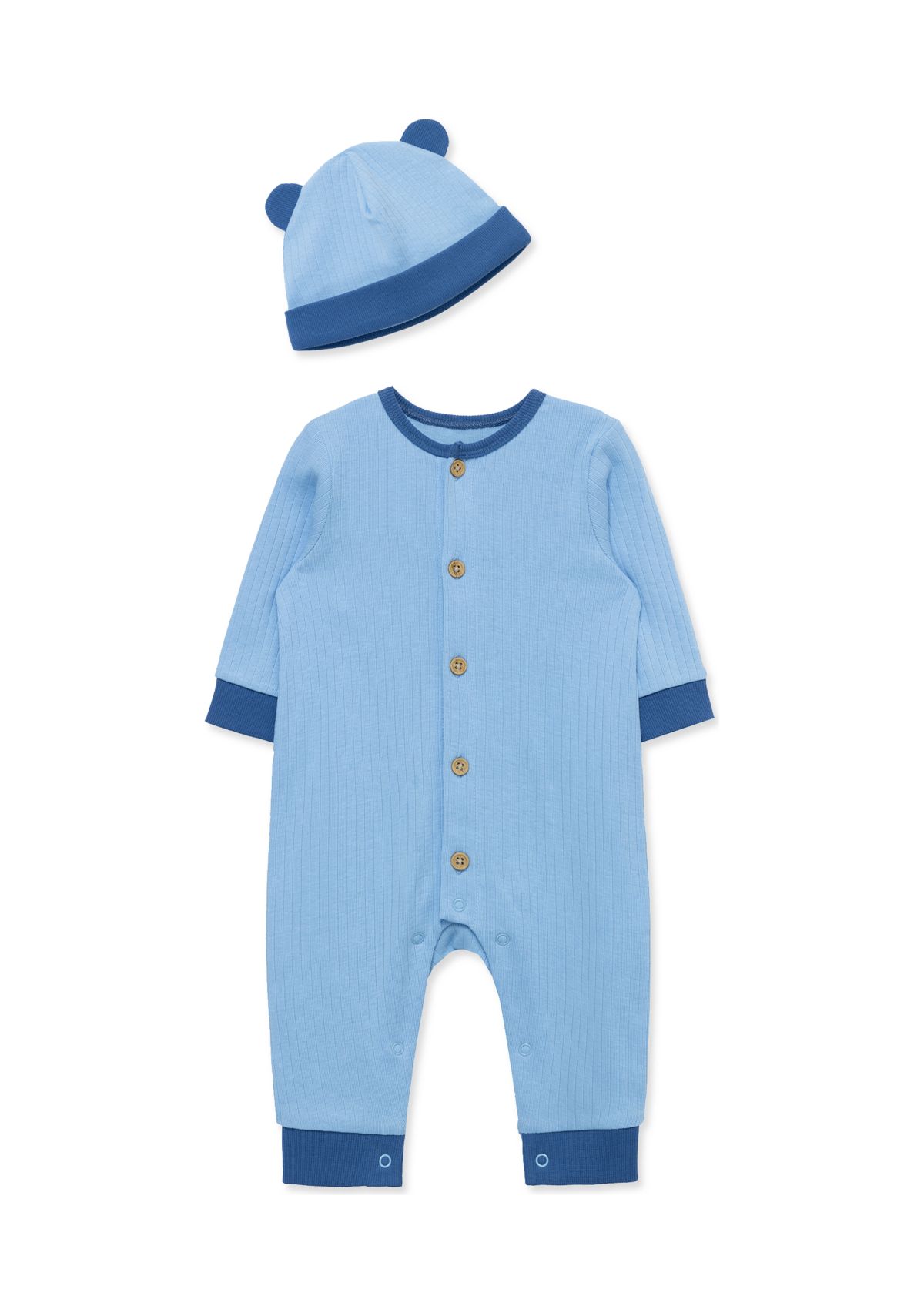 An essential in your baby's closet, Little Me’s cozy ribbed blue coverall has buttons down the front and pairs perfectly with the set's hat. Plus it’s made with organic cotton for extra coziness.