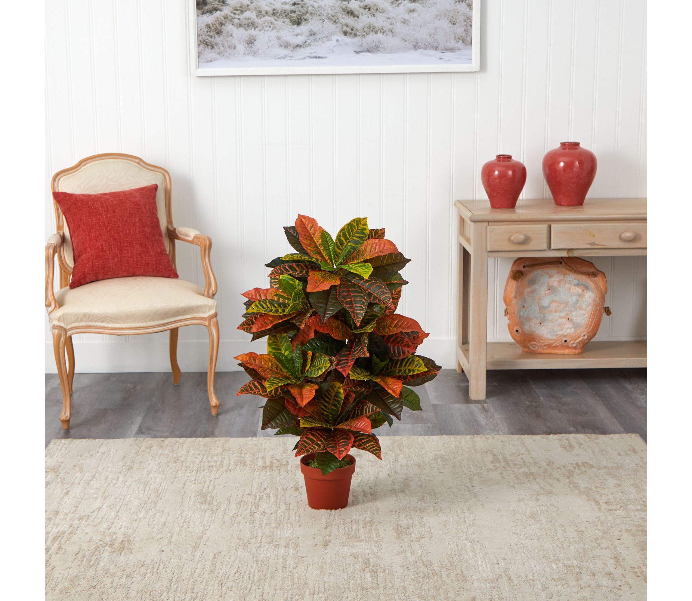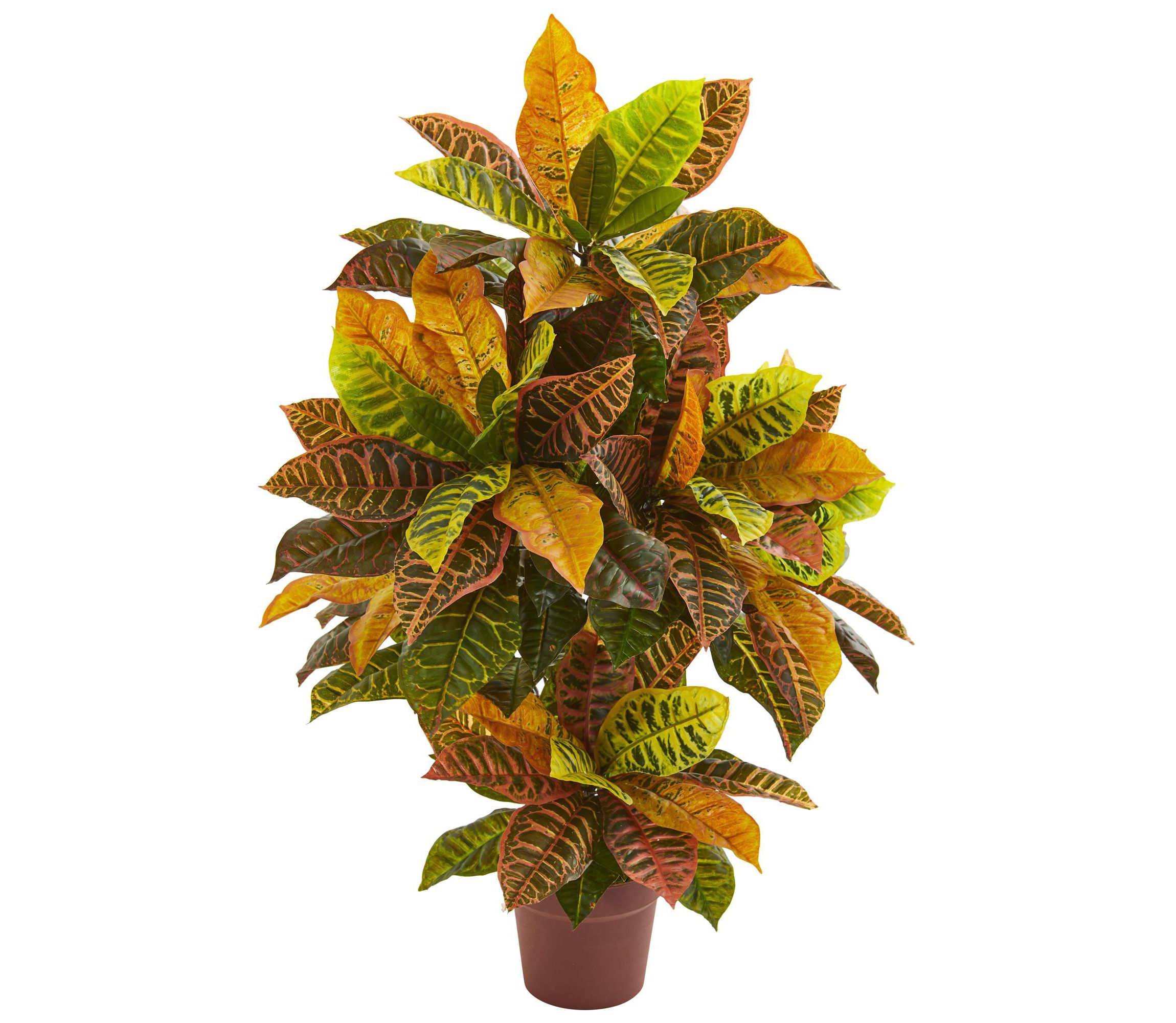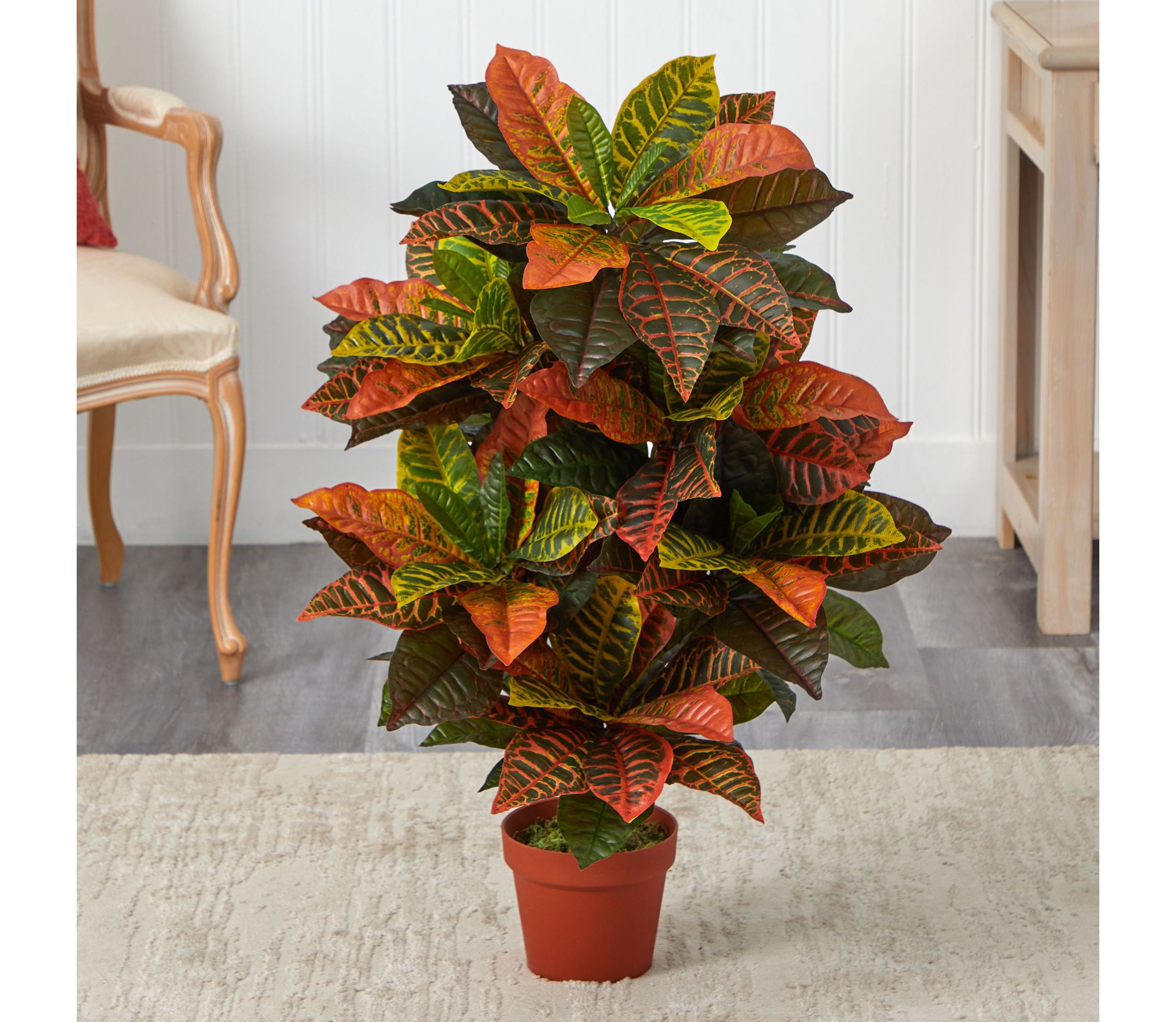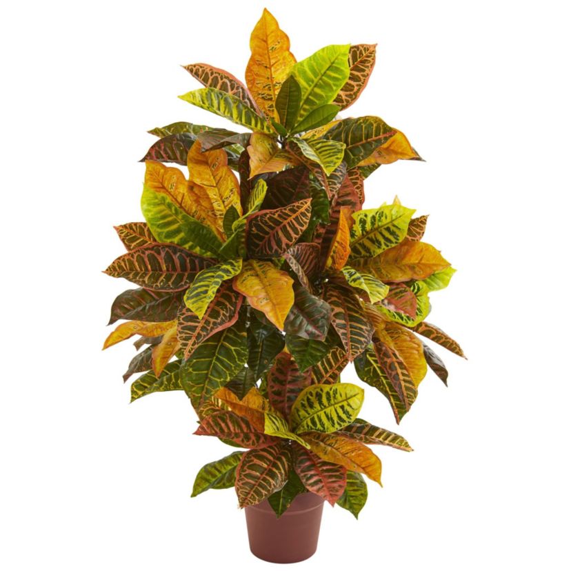 Several leaves in different shades of orange, yellow and green make up this croton variegated artificial plant. With multi-colored hues, this 36-inch piece will remind you of the sunset's stunning colors. Use it to bring a sense of serenity and relaxation to your bedroom space: nestle it on either side of your bed, vanity or dresser for a natural arrangement.