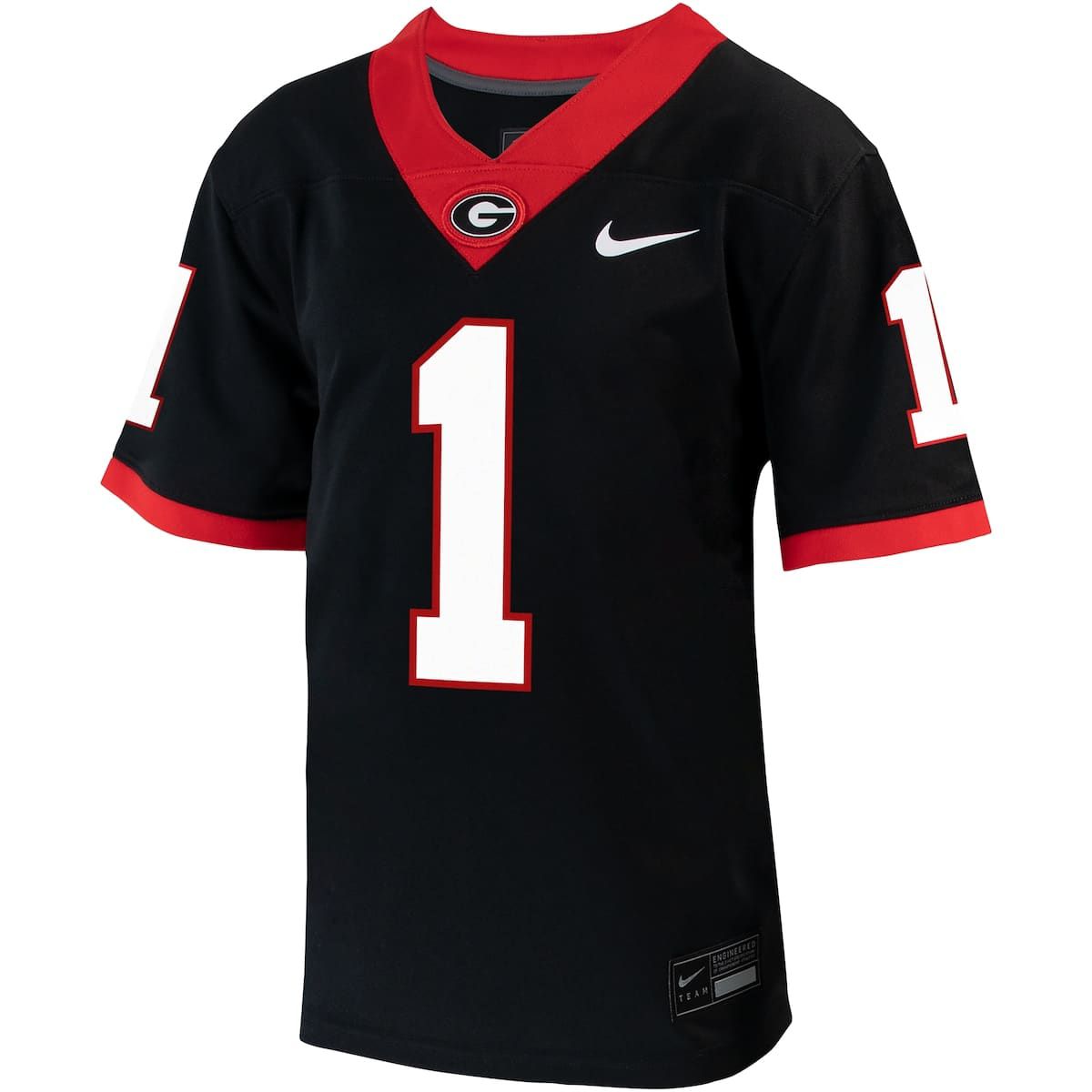 Your youngster is a devoted Georgia Bulldogs fan, and they want everyone to know who they're rooting for in this epic rivalry. Help them express their enthusiasm by grabbing them this Space Force Rivalry Alternate Game Football Jersey from Nike. This jersey features distinctive Georgia Bulldogs graphics, complete with a #1 on the front and the back, perfect for showing off their loyalty to the team. Brand: Nike; Dri-FIT technology wicks away moisture; Embroidered fabric applique at bottom neck; Heat-sealed graphics; Imported; Jersey Color Style: Alternate; Machine wash with garment inside out, tumble dry low; Material: 100% Polyester; Officially licensed; Replica; Satin twill woven jock tag; Short sleeve.