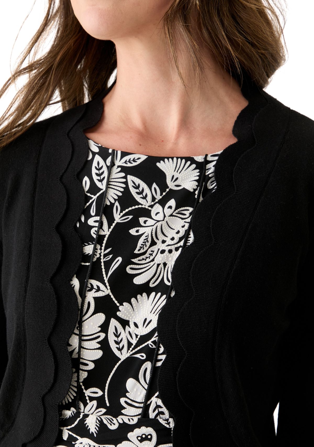 Simply chic, this elegant, scalloped shrug from Perceptions elevates any ensemble.