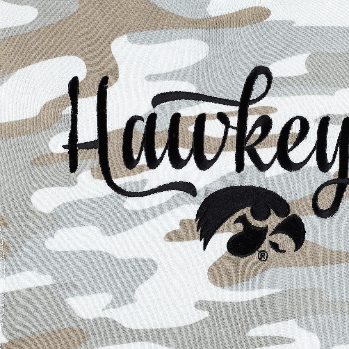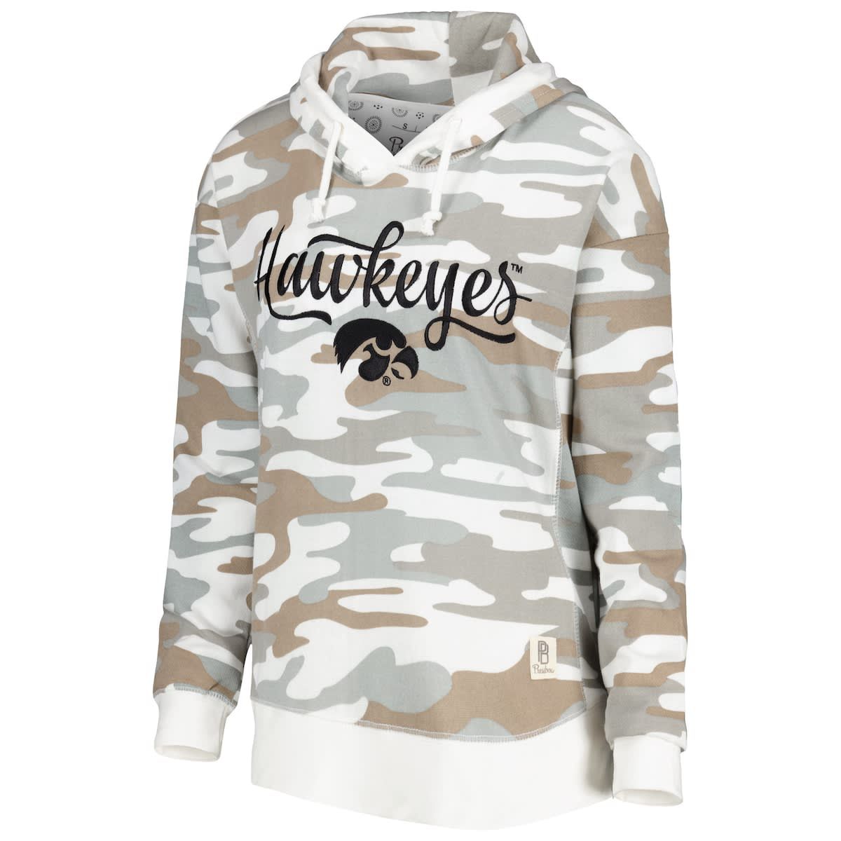 The Women's Pressbox Camo Iowa Hawkeyes San Pablo Pullover Hoodie is the perfect way to show your support for the Iowa Hawkeyes. This midweight hoodie is made from a soft cotton and polyester blend, featuring a unique camo design that may vary on each hoodie. Embroidered graphics and flatlock stitching details add a touch of style, while the French terry lining and hem with side splits provide comfort and mobility. Whether you're cheering on the Hawkeyes at the game or relaxing at home, this hoodie is sure to keep you warm and comfortable. Brand: Pressbox; Camo design may vary on each hoodie; Embroidered Logo; Embroidered graphics; Flatlock stitching detail; French terry lining; Hem with side splits; Hood with drawstring; Hooded; Imported; Long sleeve; Machine wash, tumble dry low; Material: 55% Cotton/45% Polyester; Midweight hoodie suitable for moderate temperatures; Officially licensed; Pullover; Side insets; This item is non-returnable.