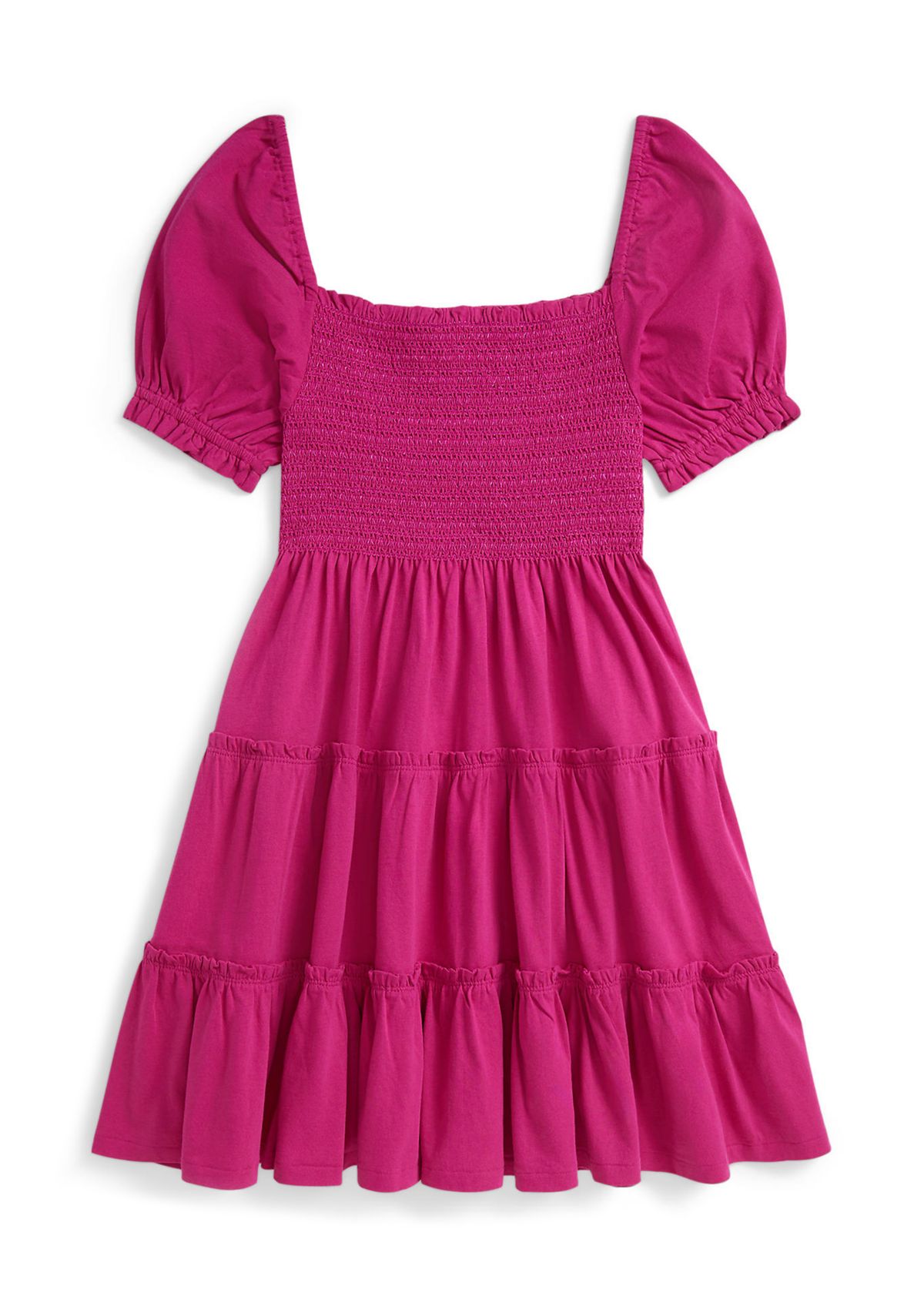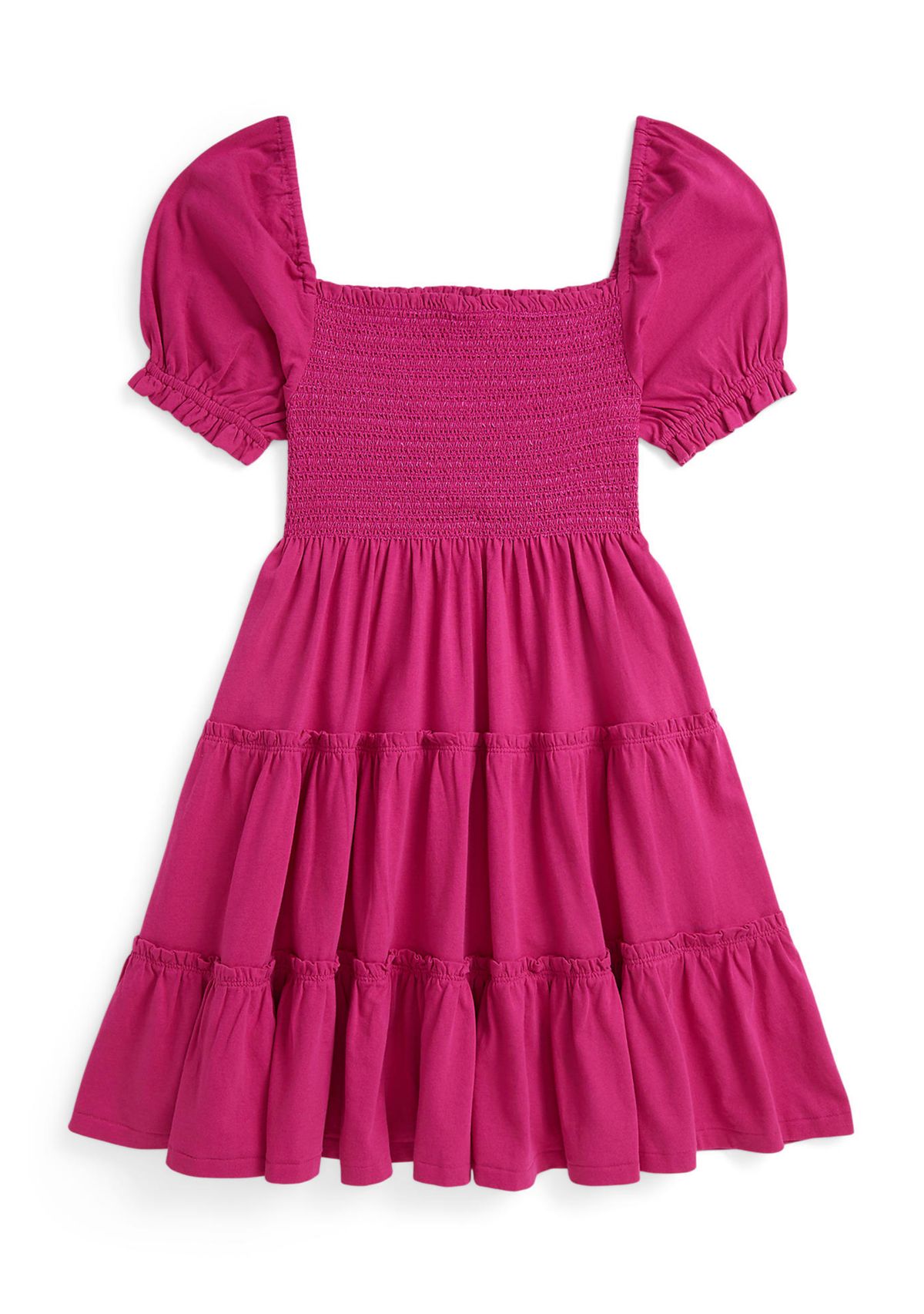 This Ralph Lauren Childrenswear dress captures breezy warm-weather style with a smocked bodice, a tiered skirt, and ruffle trim. Washed cotton jersey fabric ensures it’s as comfortable as it is cute.