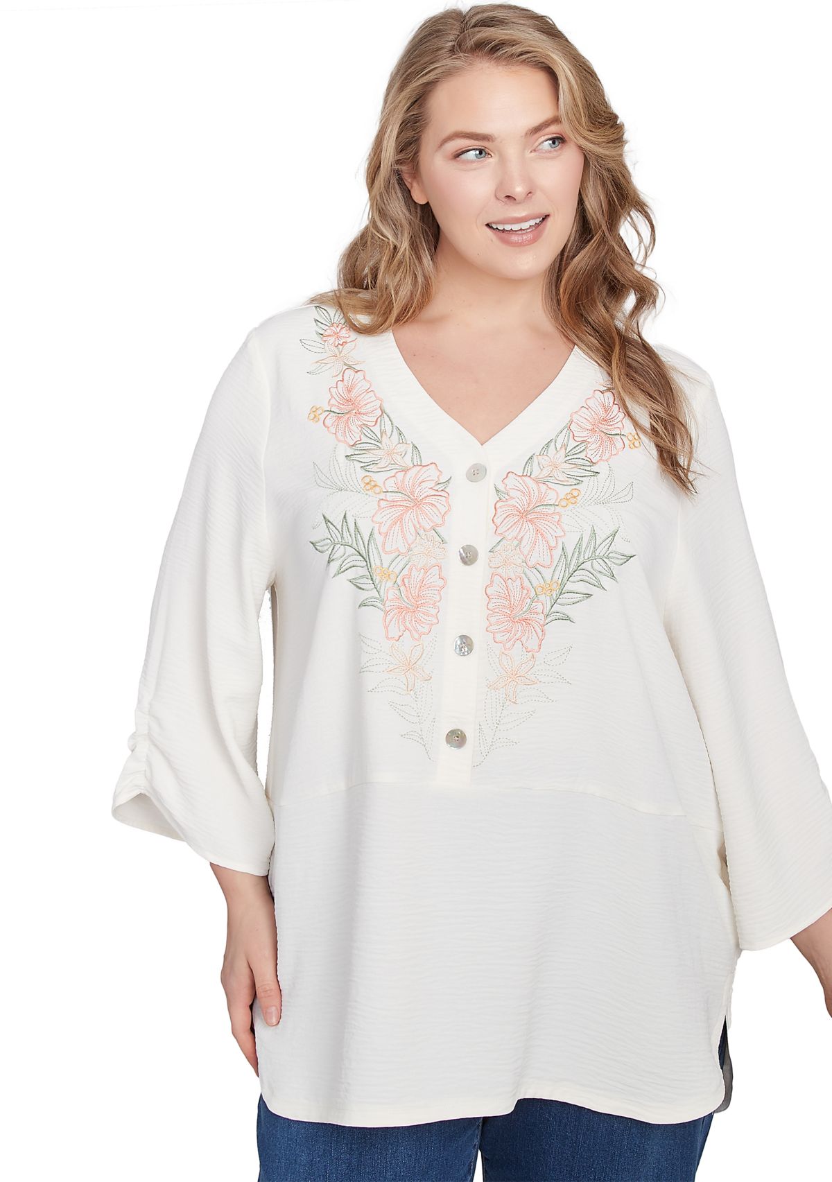 Ruby Rd's gorgeous top boasts a vibrant floral embroidery design, adding a touch of color and personality to your wardrobe. Its flattering silhouette is accentuated by a henley-style V-neckline and 3/4 sleeves. Crafted from soft and breathable woven gauze fabric, it ensures the utmost comfort. The buttoned front closure adds a classic touch, making it a versatile piece for any occasion.
