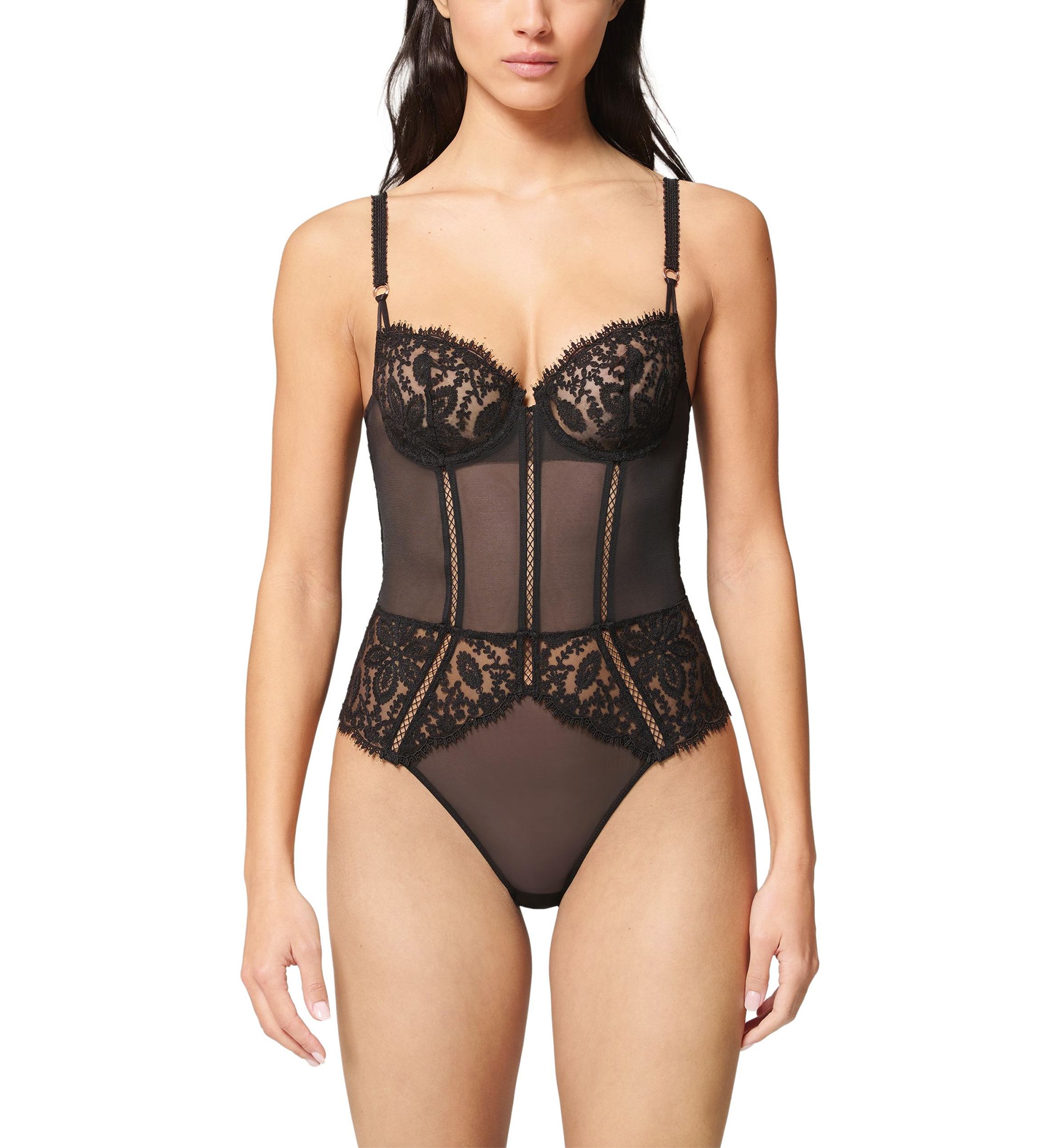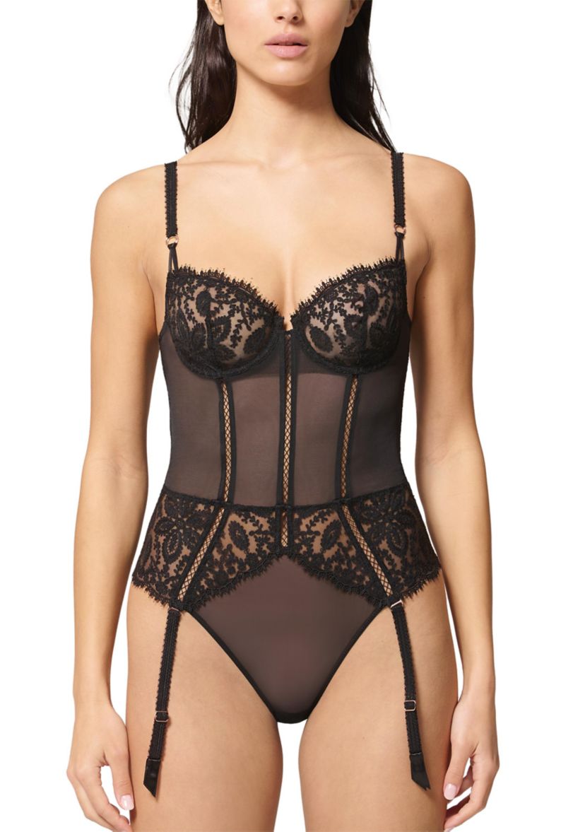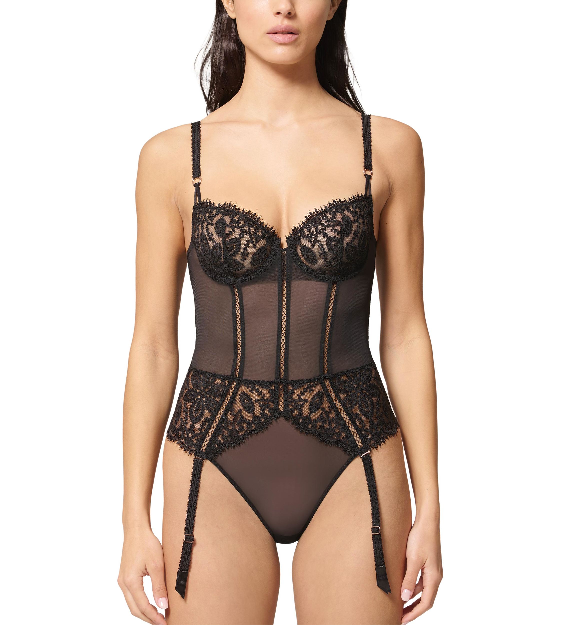 Experience unparalleled comfort and elegance with this exquisite underwired bodysuit, designed to enhance your natural shape. Featuring delicate embroidery and soft tulle, it offers a flattering half-cup silhouette and brief bottom style with vertical gathers for a subtly enhanced rear. Enjoy the convenience of adjustable and removable garters, a secure snap button fastening, and a 100% cotton gusset. Designed in France, this piece is crafted with recycled fibers, reflecting a commitment to sustainability. Indulge in luxurious lingerie that makes you feel confident and beautiful. Shop now and embrace your inner radiance.